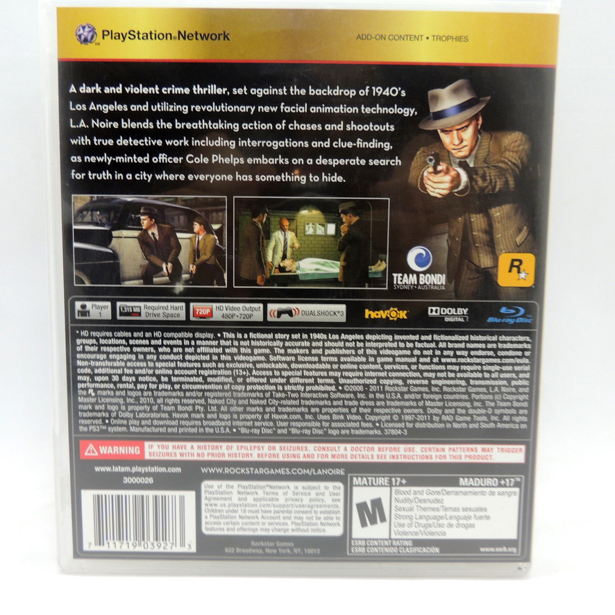 L.A. LA Noire Rockstar Games Sony Play Station 3 PS3 Video Juego Colección