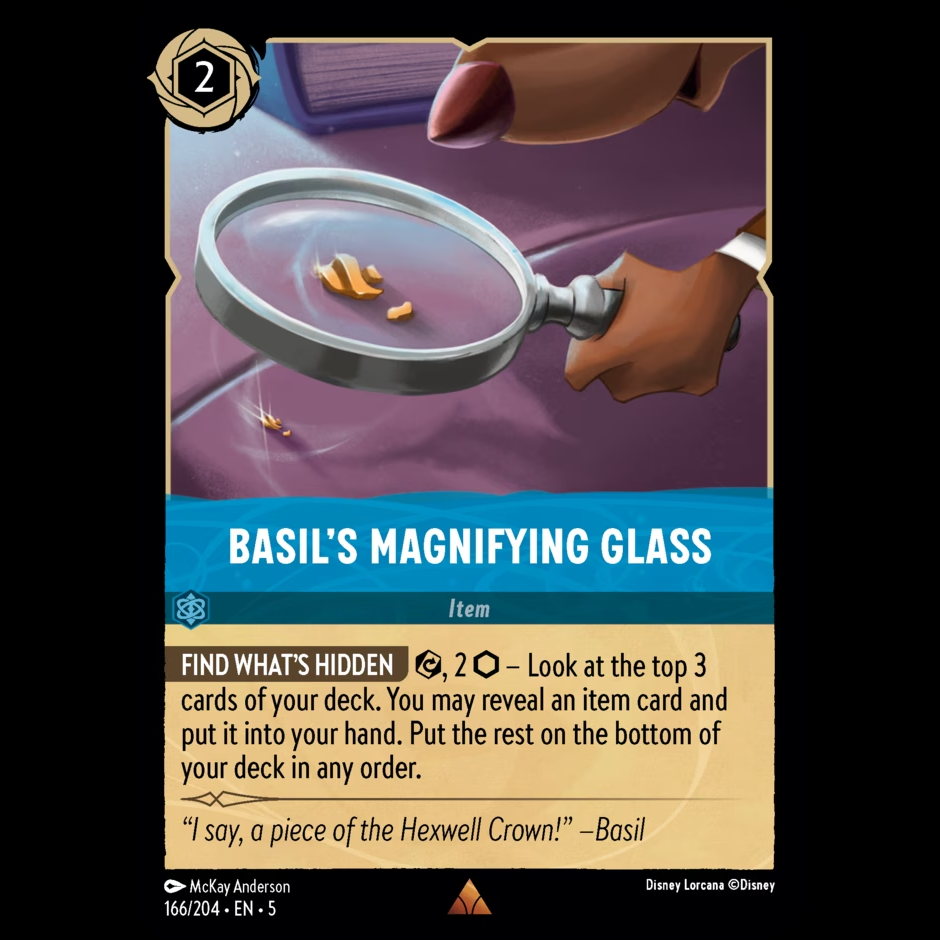 Lorcana Basil's Magnifying Glass - Shimmering Skies 5#166FIND WHAT'S HIDDEN , 2 — Look at the top 3 cards of your deck. You may reveal an item card and put it into your hand. Put the rest on the bottom of your deck in any order.