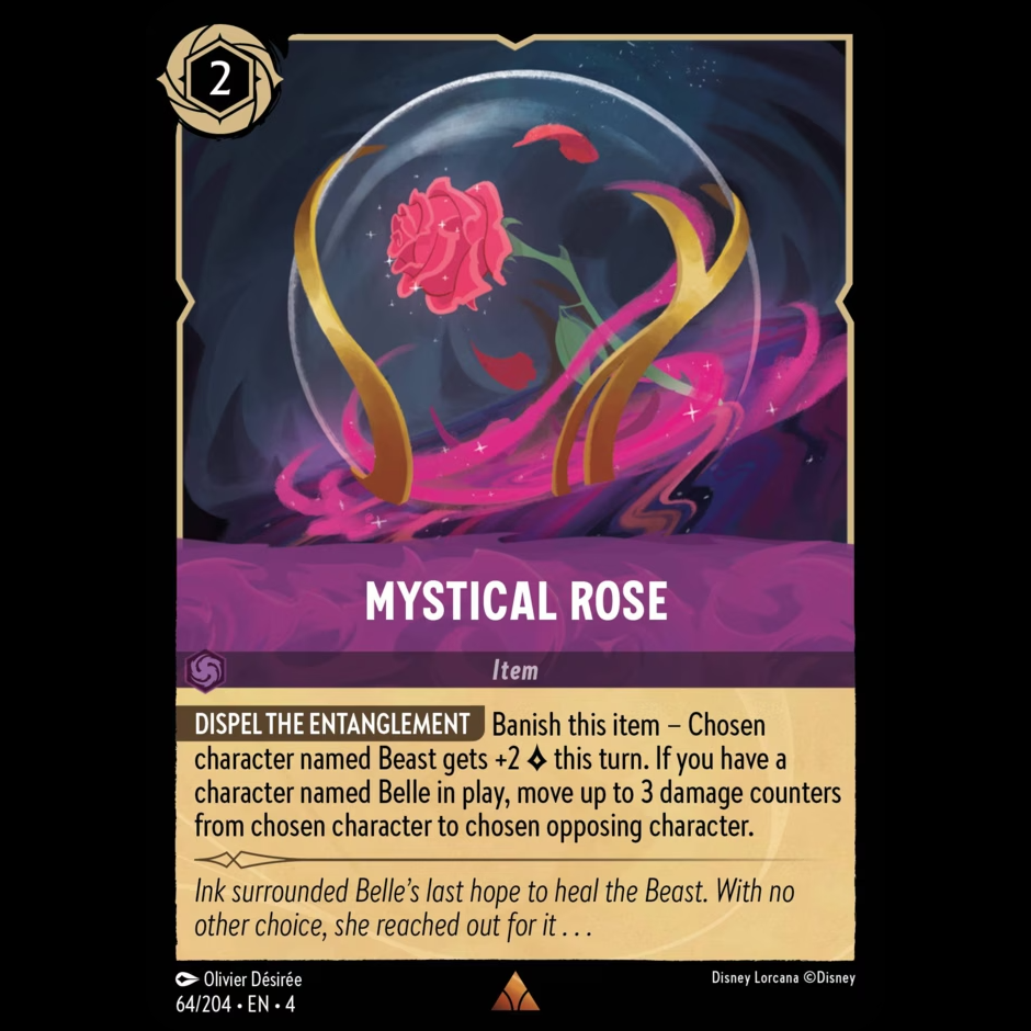 DISPEL THE ENTANGLEMENT Banish this item – Chosen character named Beast gets +2 this turn. If you have a character named Belle in play, move up to 3 damage counters from chosen character to chosen opposing character.