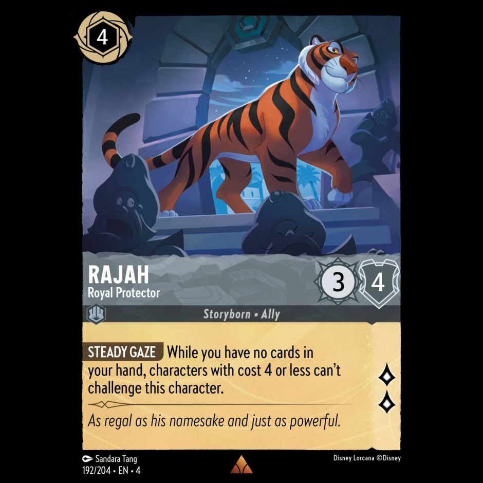 STEADY GAZE While you have no cards in your hand, characters with cost 4 or less can't challenge this character.