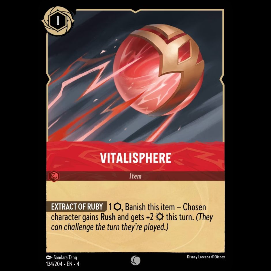 EXTRACT OF RUBY 1 , Banish this item – Chosen character gains Rush and gets +2 this turn. (They can challenge the turn they’re played.)