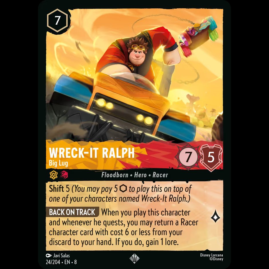 Shift 5 (You may pay 5 to play this on top of one of your characters named Wreck-It Ralph.) BACK ON TRACK When you play this character and whenever he quests, you may return a Racer character card with cost 6 or less from your discard to your hand. If you do, gain 1 lore.