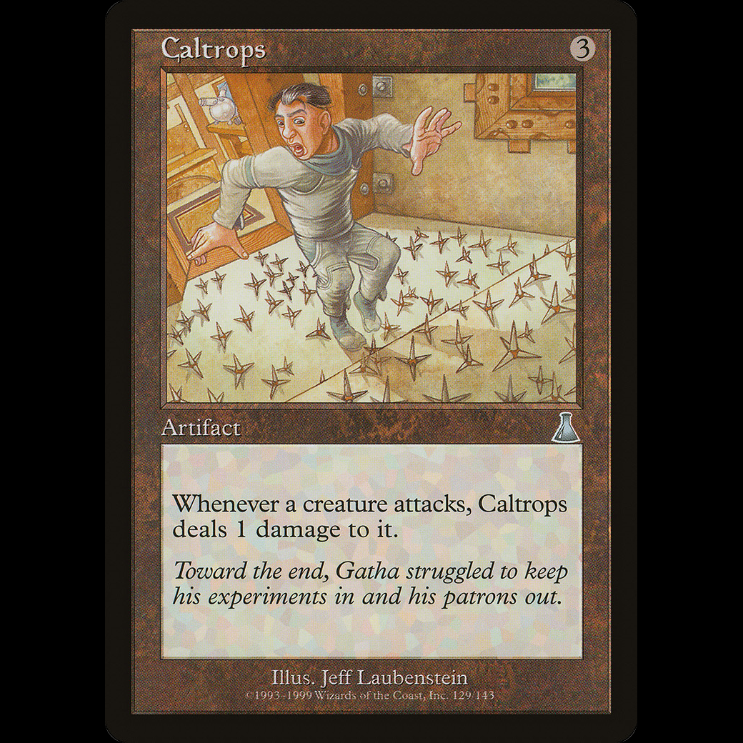 Whenever a creature attacks, Caltrops deals 1 damage to it.