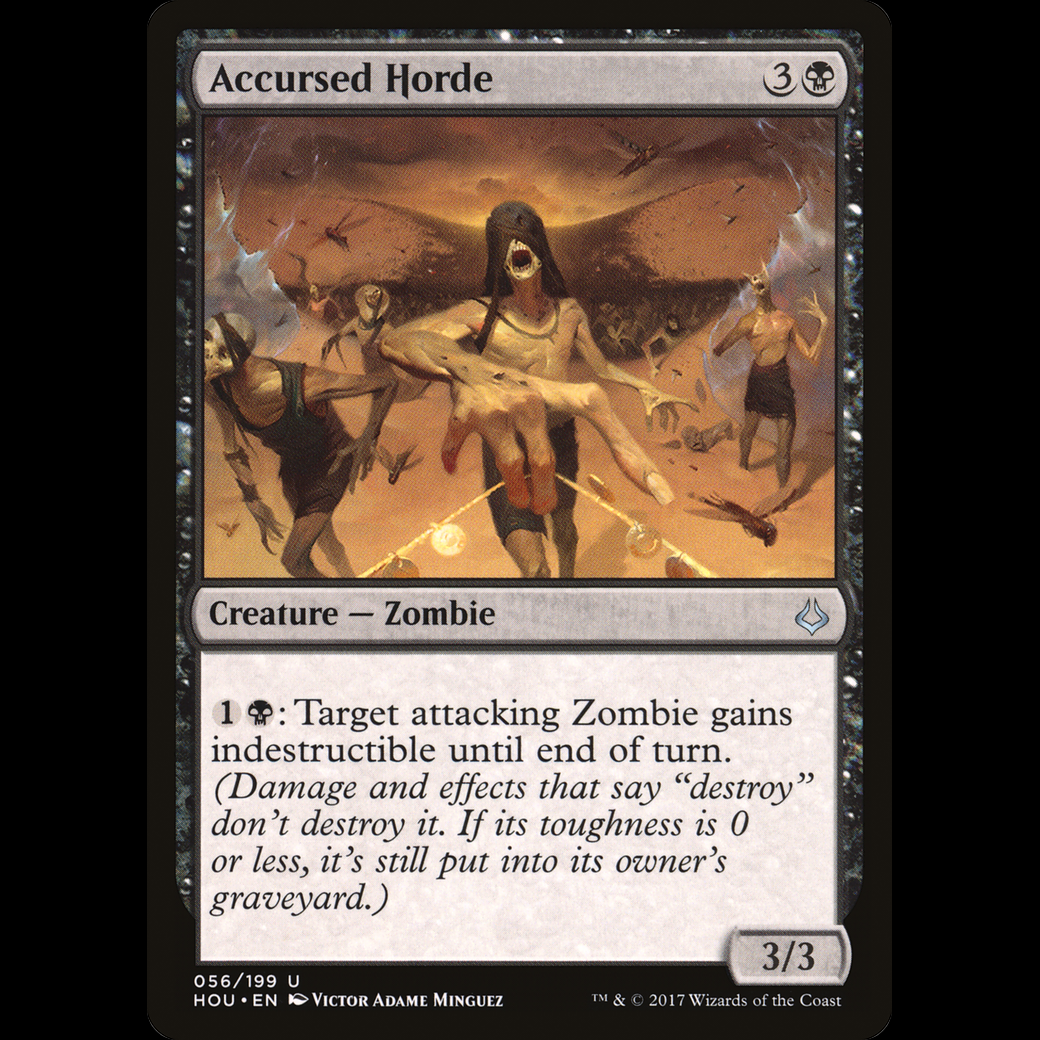 : Target attacking Zombie gains indestructible until end of turn. (Damage and effects that say "destroy" don't destroy it. If its toughness is 0 or less, it's still put into its owner's graveyard.)