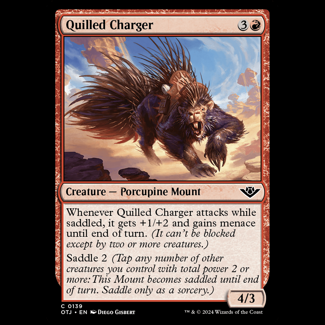 MTG Acometedor espinoso (Quilled Charger) Outlaws of Thunder Junction otj#139 Whenever Quilled Charger attacks while saddled, it gets +1/+2 and gains menace until end of turn. (It can't be blocked except by two or more creatures.) Saddle 2 (Tap any number of other creatures you control with total power 2 or more: This Mount becomes saddled until end of turn. Saddle only as a sorcery.)