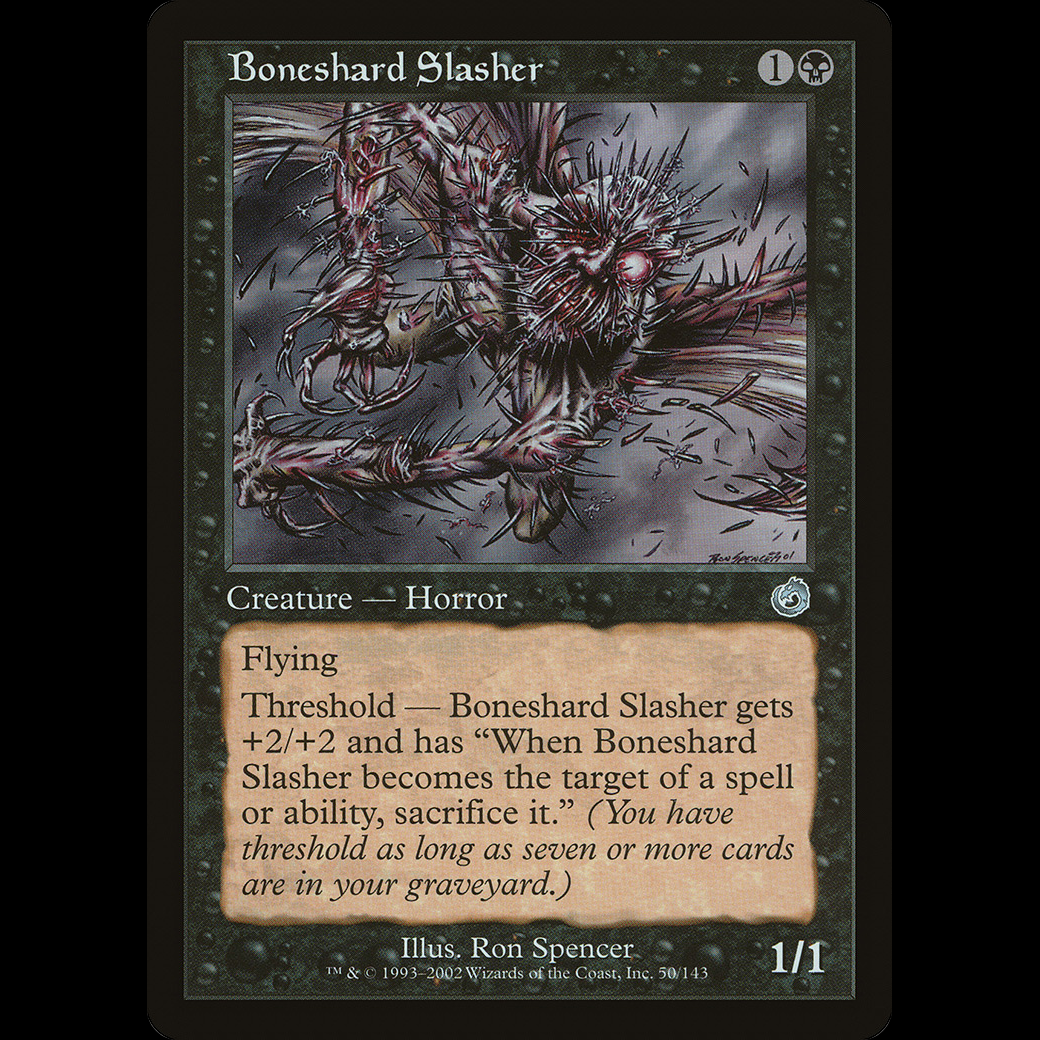 Threshold — As long as seven or more cards are in your graveyard, Boneshard Slasher gets +2/+2 and has