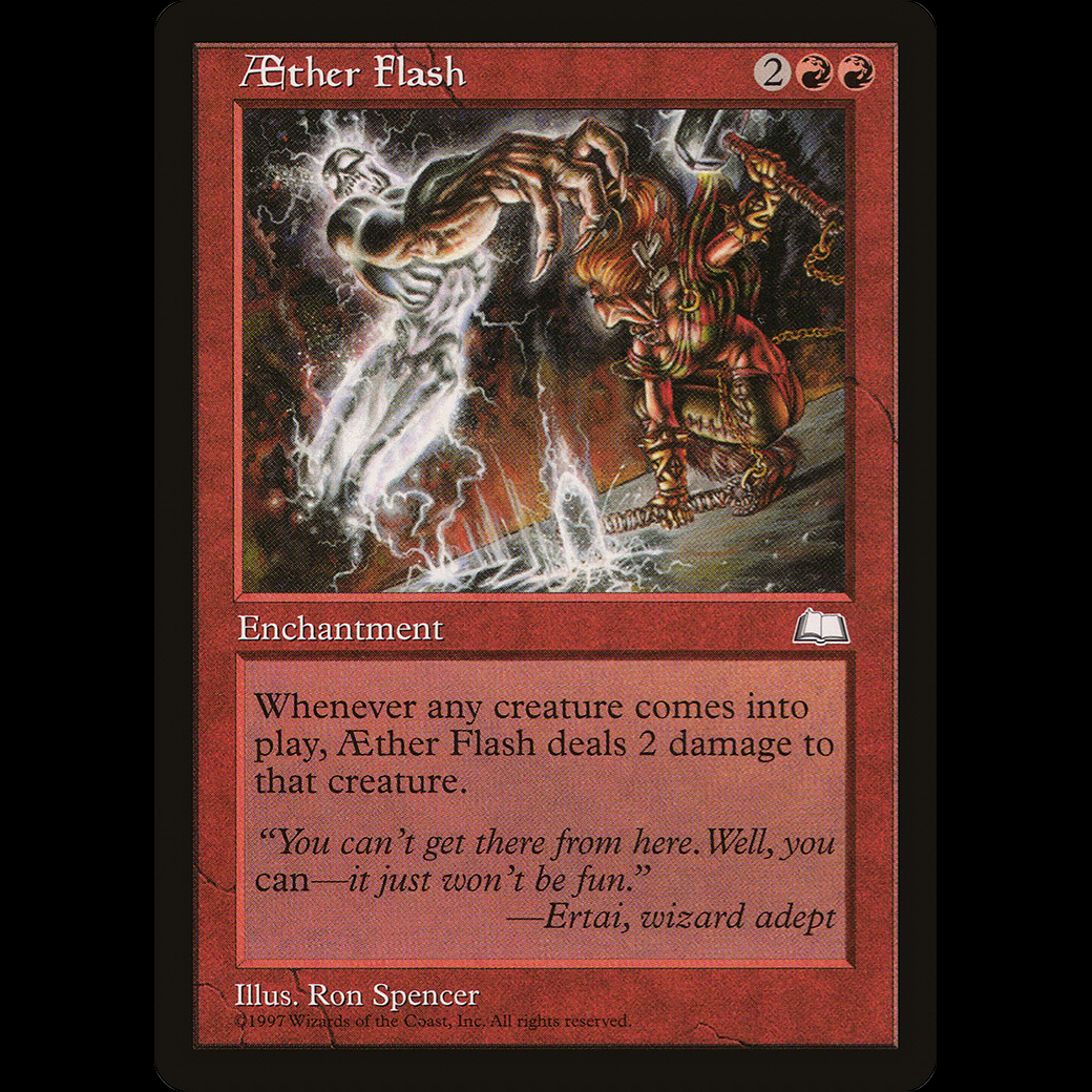 Whenever a creature enters the battlefield, Aether Flash deals 2 damage to it.