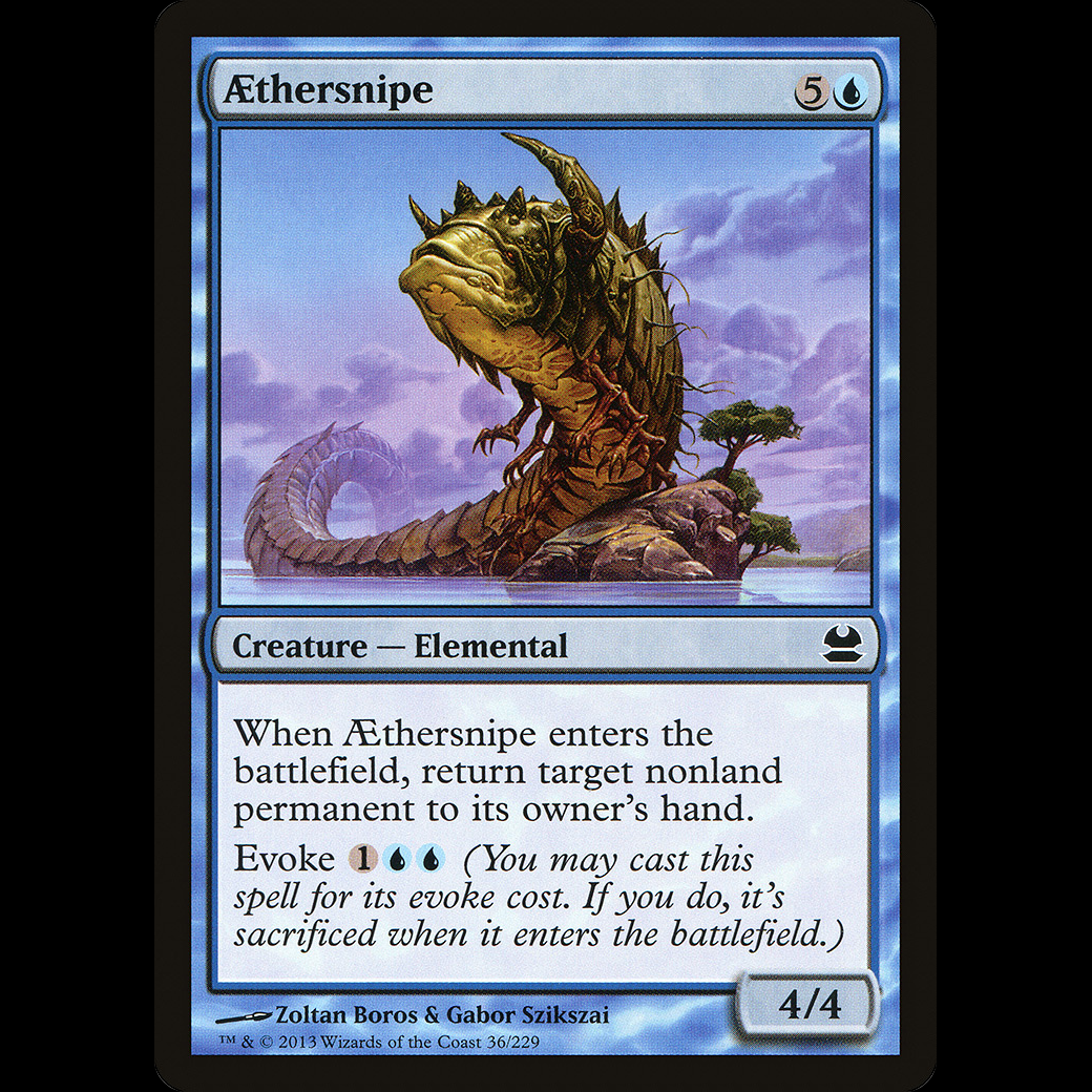 When Aethersnipe enters the battlefield, return target nonland permanent to its owner's hand.