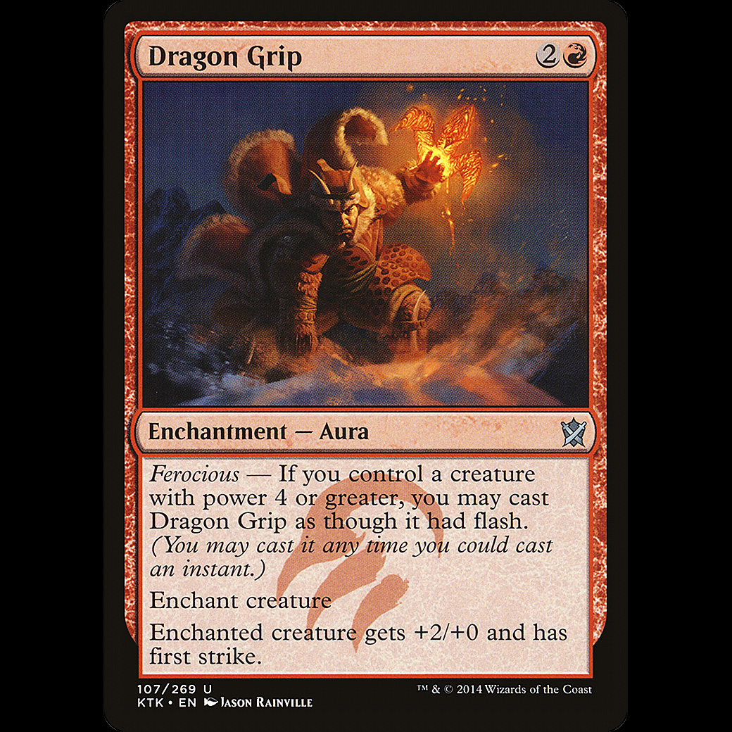 Ferocious — If you control a creature with power 4 or greater, you may cast Dragon Grip as though it had flash. (You may cast it any time you could cast an instant.)