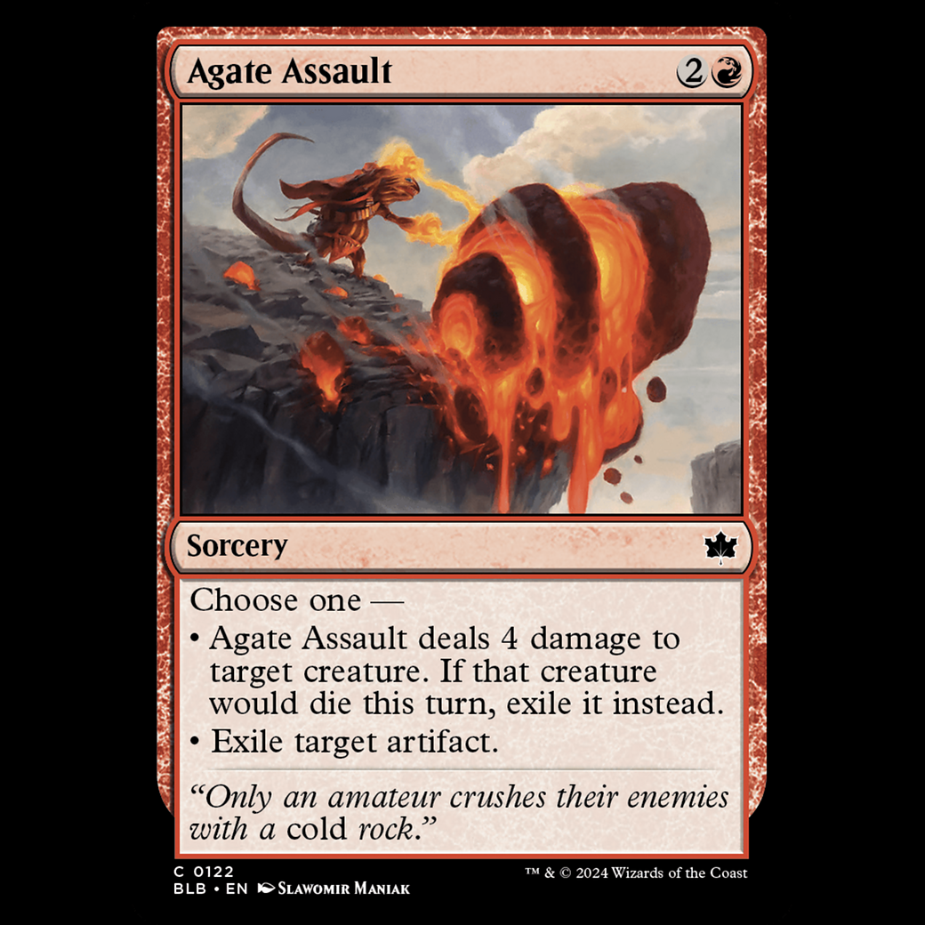 • Agate Assault deals 4 damage to target creature. If that creature would die this turn, exile it instead.