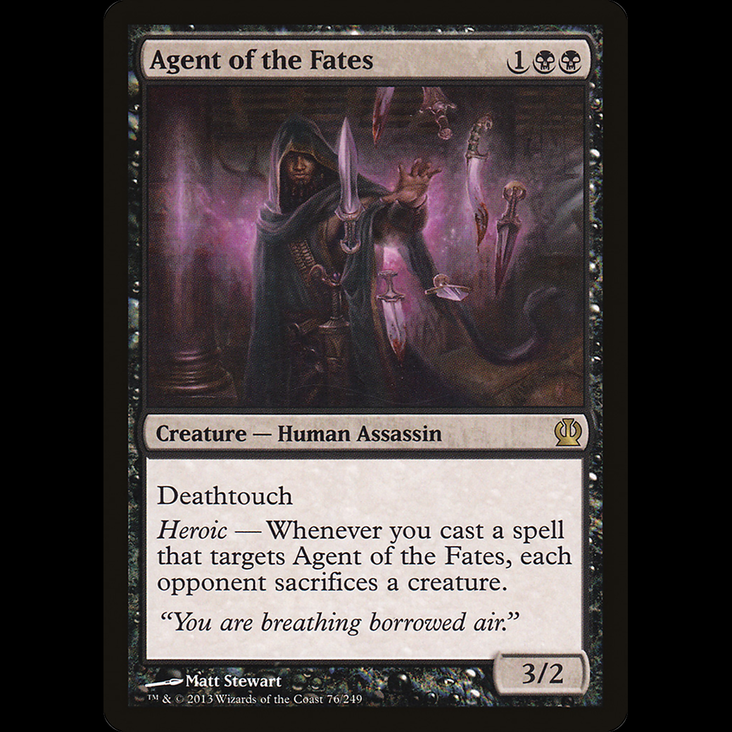 Heroic — Whenever you cast a spell that targets Agent of the Fates, each opponent sacrifices a creature.