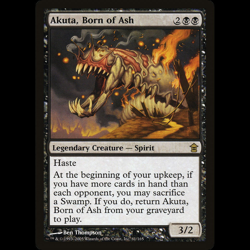 At the beginning of your upkeep, if you have more cards in hand than each opponent, you may sacrifice a Swamp. If you do, return Akuta, Born of Ash from your graveyard to the battlefield.