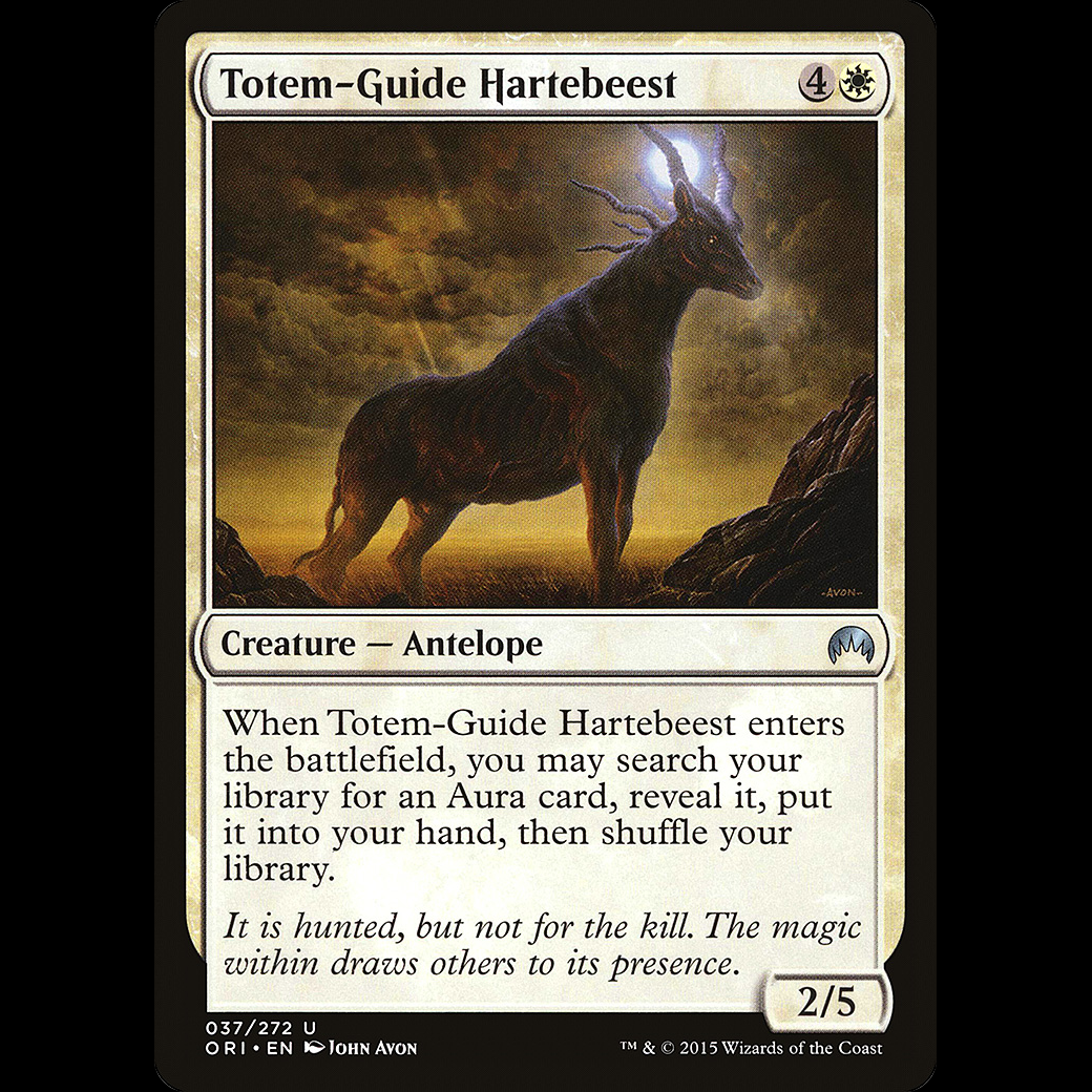When Totem-Guide Hartebeest enters the battlefield, you may search your library for an Aura card, reveal it, put it into your hand, then shuffle.