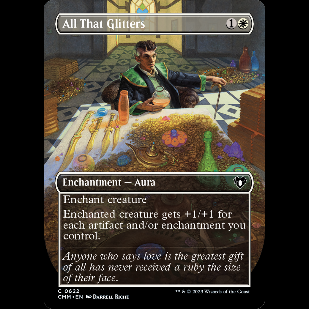 Enchanted creature gets +1/+1 for each artifact and/or enchantment you control.