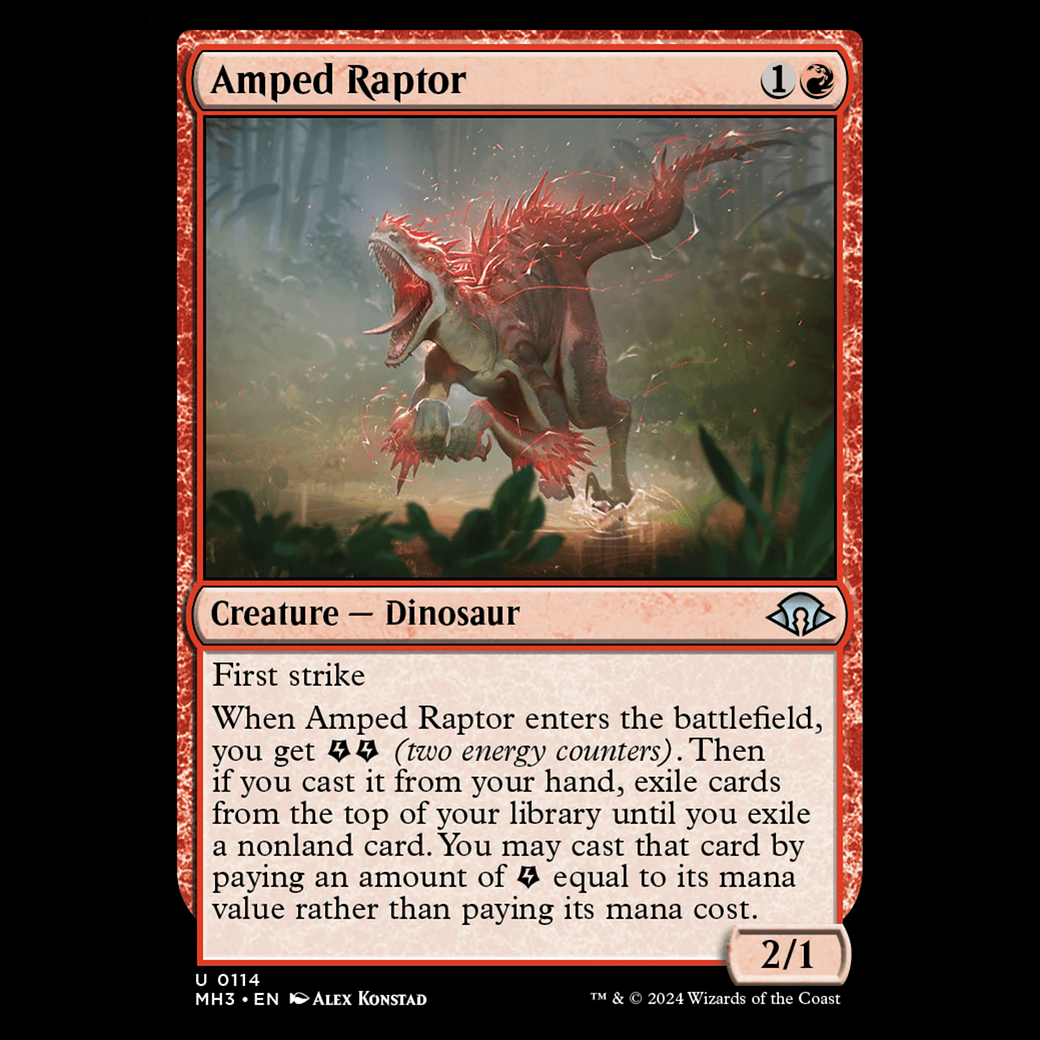 When Amped Raptor enters, you get (two energy counters). Then if you cast it from your hand, exile cards from the top of your library until you exile a nonland card. You may cast that card by paying an amount of equal to its mana value rather than paying its mana cost.