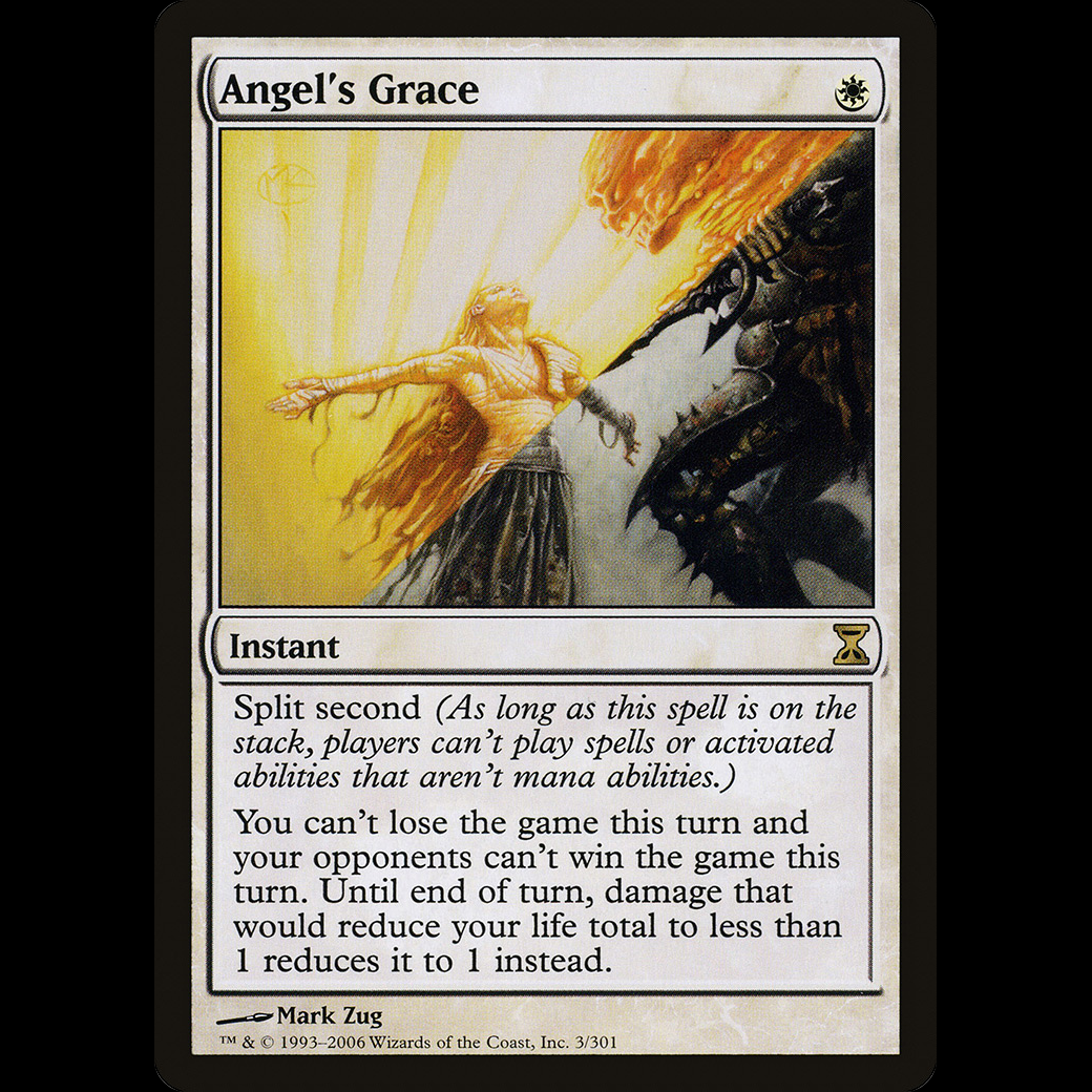 You can't lose the game this turn and your opponents can't win the game this turn. Until end of turn, damage that would reduce your life total to less than 1 reduces it to 1 instead.