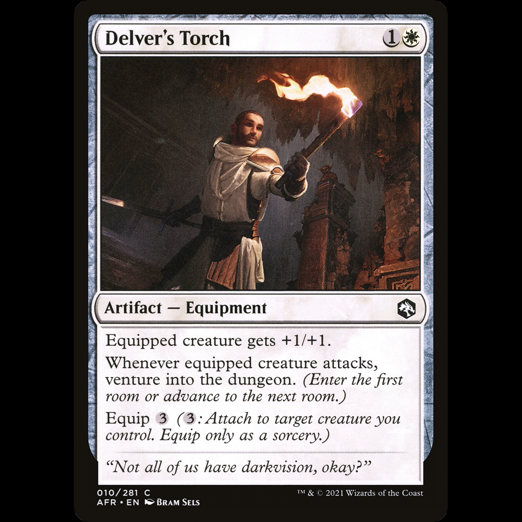 Whenever equipped creature attacks, venture into the dungeon. (Enter the first room or advance to the next room.)