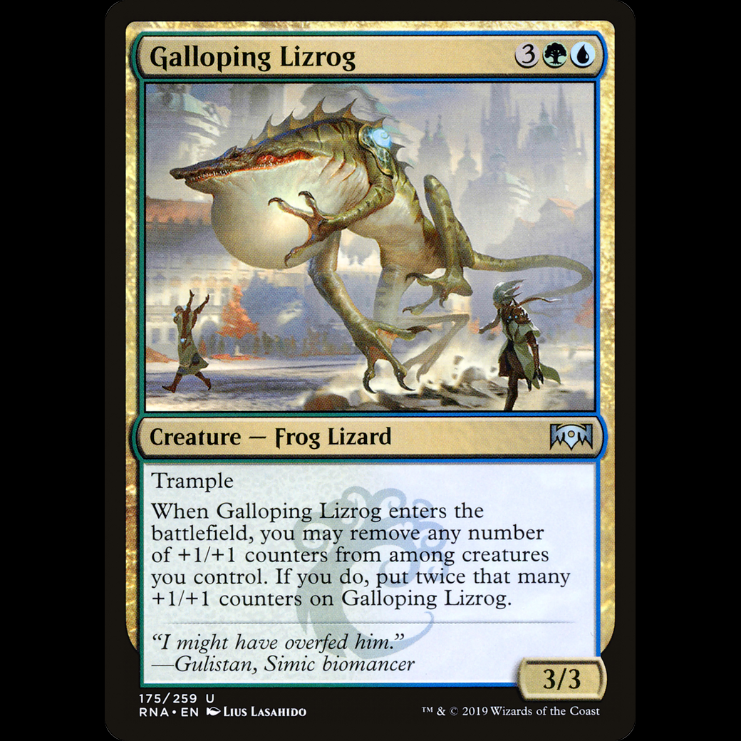 When Galloping Lizrog enters, you may remove any number of +1/+1 counters from among creatures you control. If you do, put twice that many +1/+1 counters on Galloping Lizrog.