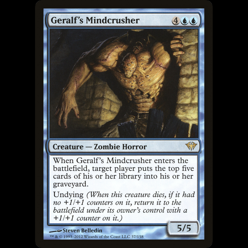 When Geralf's Mindcrusher enters the battlefield, target player mills five cards.