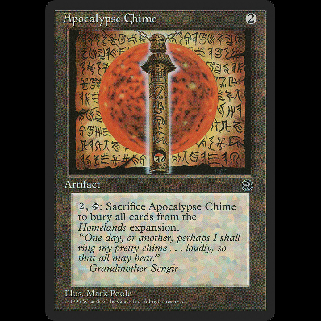 , , Sacrifice Apocalypse Chime: Destroy all nontoken permanents with a name originally printed in the Homelands expansion. They can't be regenerated.