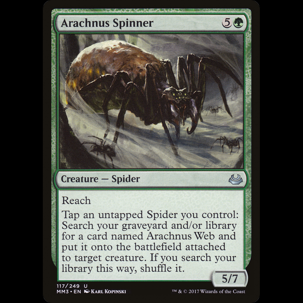 Tap an untapped Spider you control: Search your graveyard and/or library for a card named Arachnus Web and put it onto the battlefield attached to target creature. If you search your library this way, shuffle.