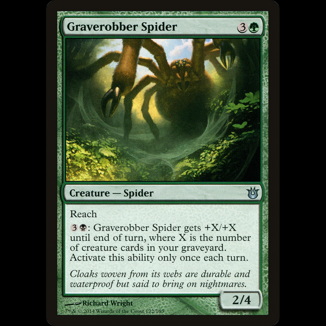 : Graverobber Spider gets +X/+X until end of turn, where X is the number of creature cards in your graveyard. Activate only once each turn.