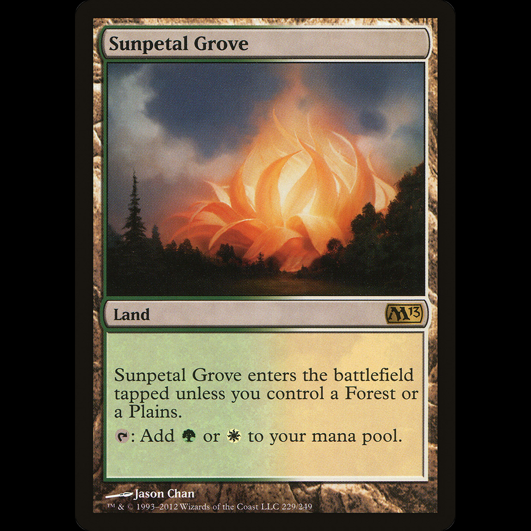 Sunpetal Grove enters the battlefield tapped unless you control a Forest or a Plains.