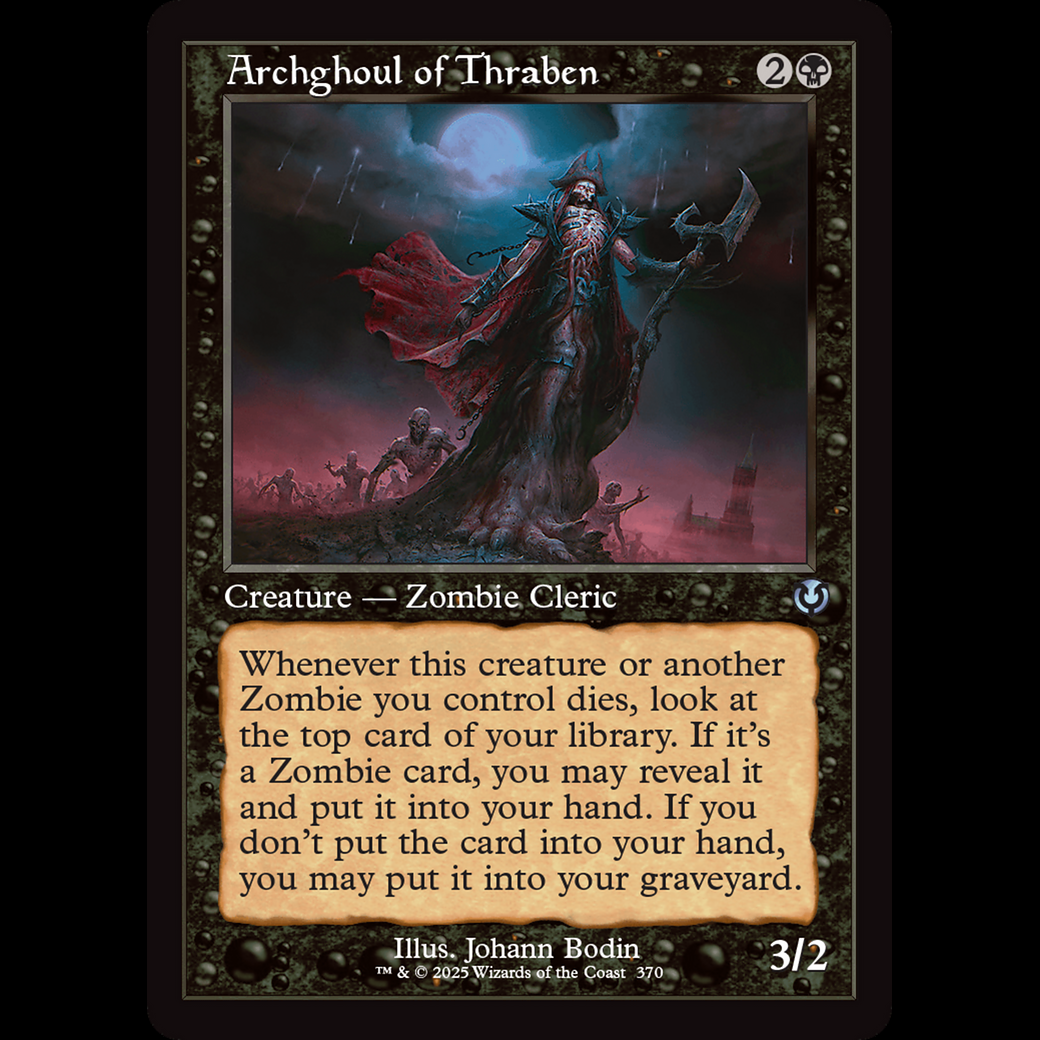 Whenever Archghoul of Thraben or another Zombie you control dies, look at the top card of your library. If it's a Zombie card, you may reveal it and put it into your hand. If you don't put the card into your hand, you may put it into your graveyard.