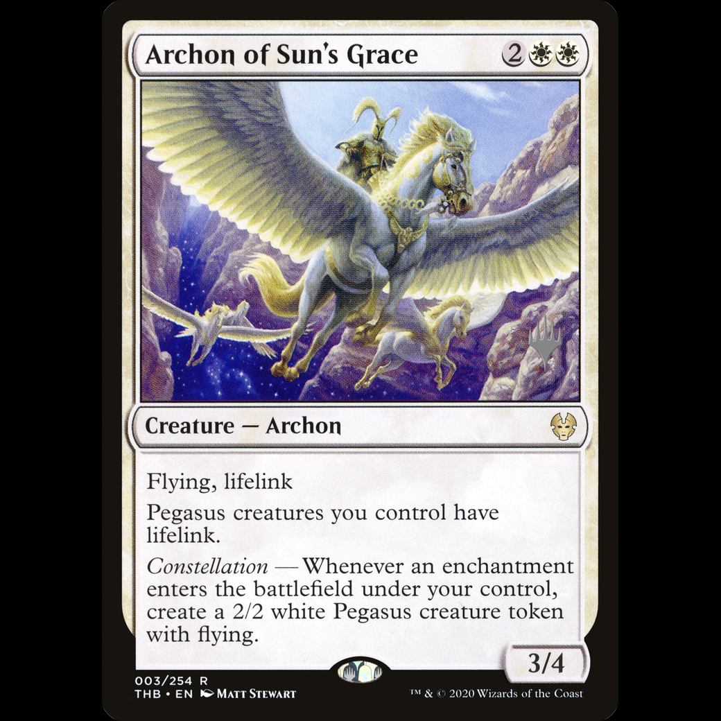 MTG Arconte de la gracia solar (Archon of Sun's Grace) Theros Beyond Death Promos pthb#3p Flying Lifelink (Damage dealt by this creature also causes you to gain that much life.) Pegasus creatures you control have lifelink. Constellation — Whenever an enchantment you control enters, create a 2/2 white Pegasus creature token with flying.
