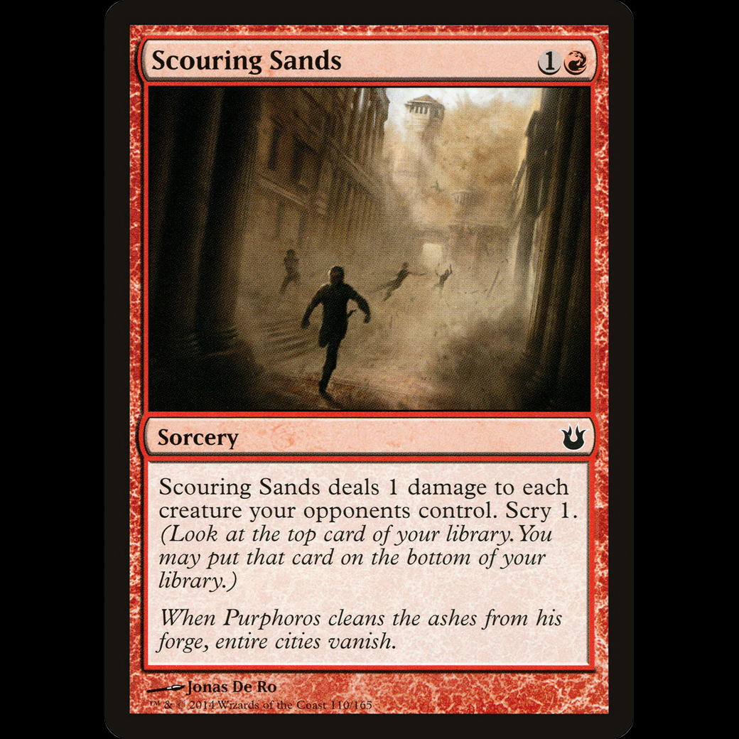 Scouring Sands deals 1 damage to each creature your opponents control. Scry 1. (Look at the top card of your library. You may put that card on the bottom of your library.)