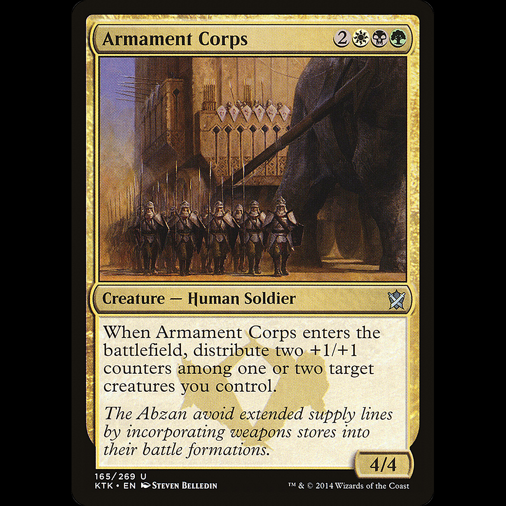 When Armament Corps enters the battlefield, distribute two +1/+1 counters among one or two target creatures you control.