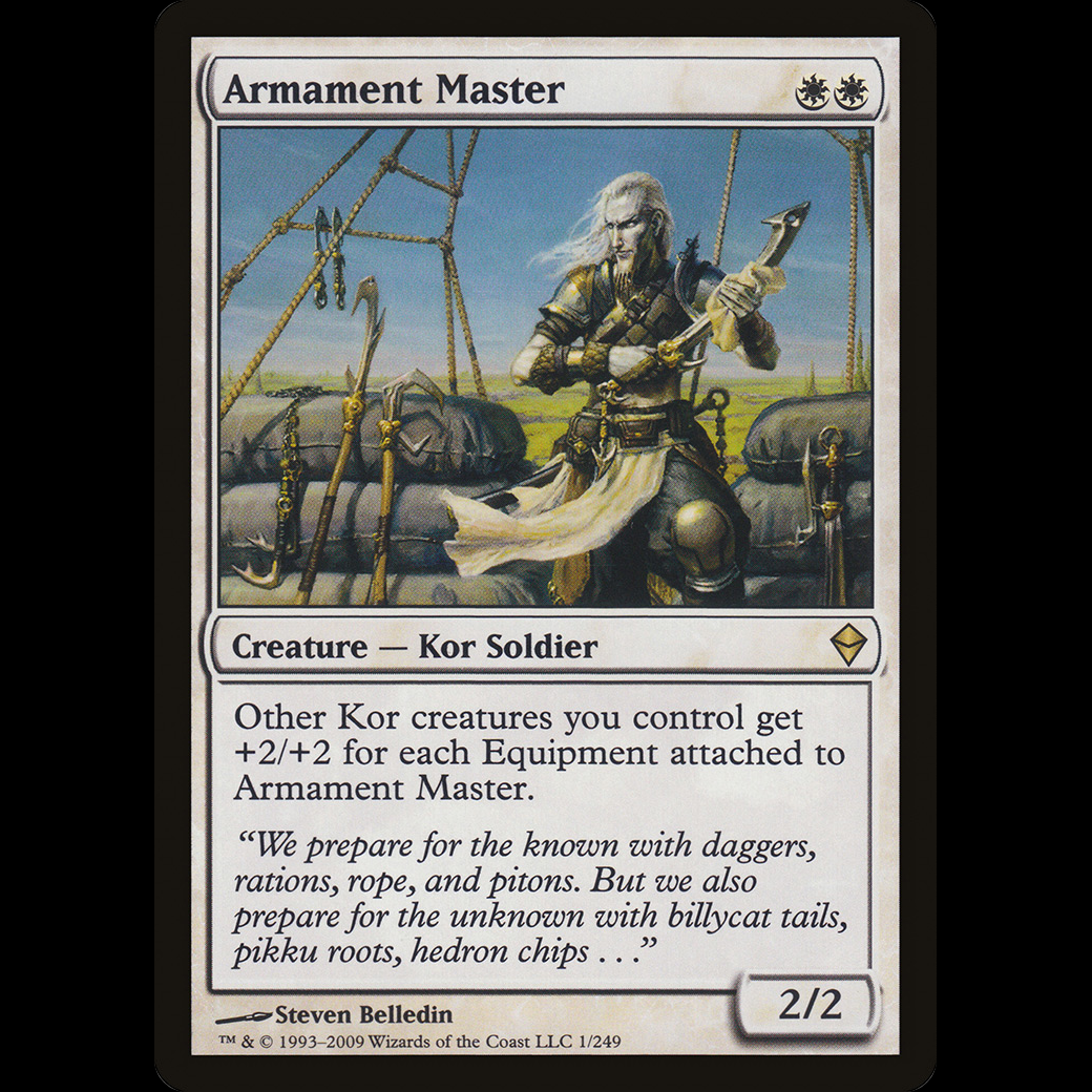 Other Kor creatures you control get +2/+2 for each Equipment attached to Armament Master.