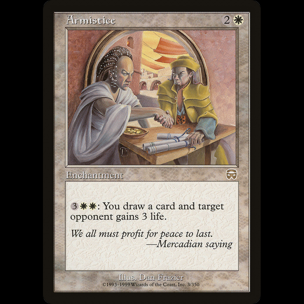 MTG Armistice Mercadian Masques: You draw a card and target opponent gains 3 life.