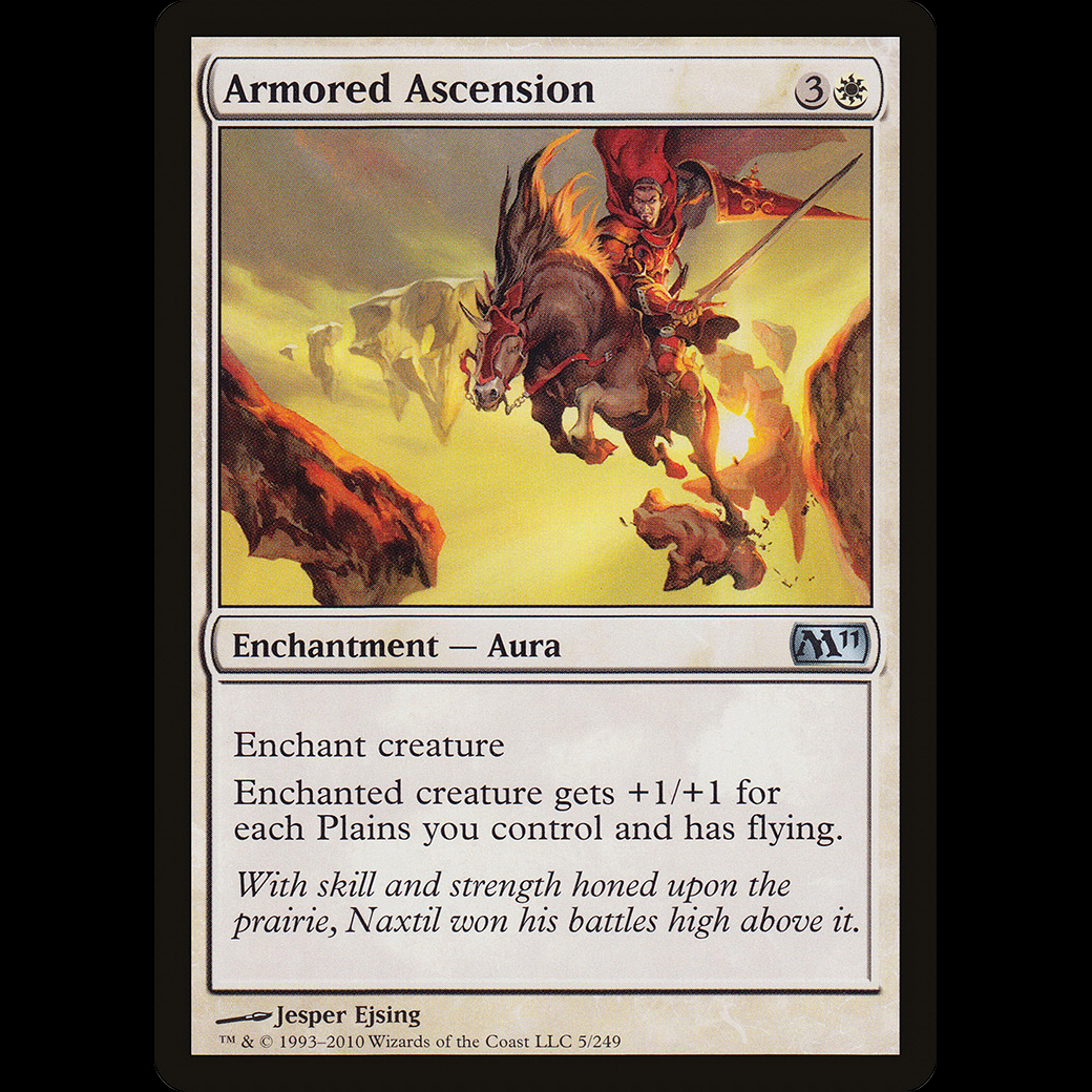 Enchanted creature gets +1/+1 for each Plains you control and has flying.