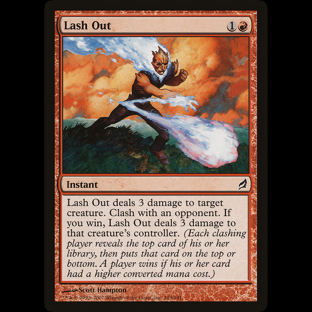 Lash Out deals 3 damage to target creature. Clash with an opponent. If you win, Lash Out deals 3 damage to that creature's controller. (Each clashing player reveals the top card of their library, then puts that card on the top or bottom. A player wins if their card had a higher mana value.)