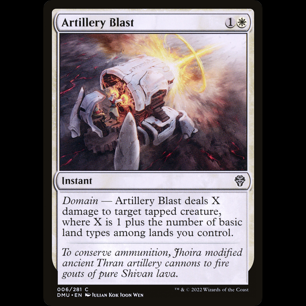 Domain — Artillery Blast deals X damage to target tapped creature, where X is 1 plus the number of basic land types among lands you control.