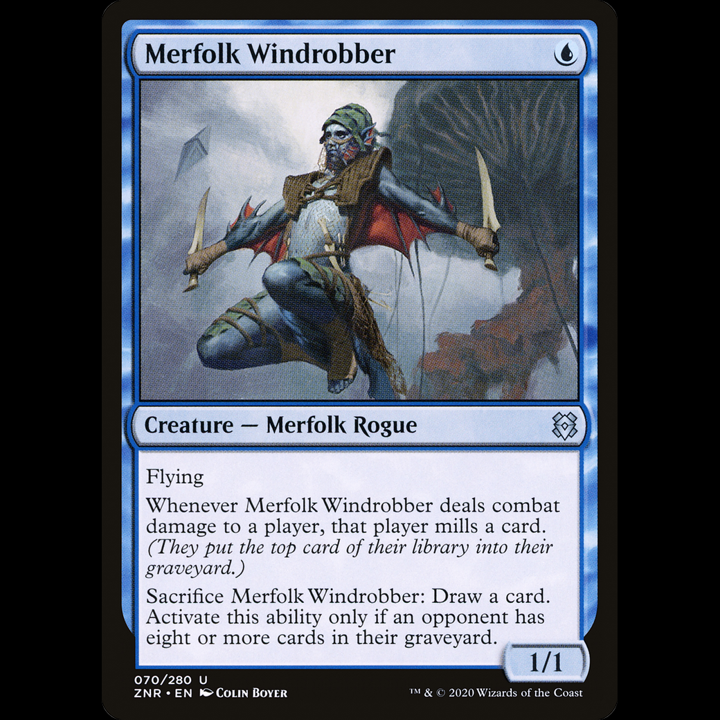 Whenever Merfolk Windrobber deals combat damage to a player, that player mills a card. (They put the top card of their library into their graveyard.)