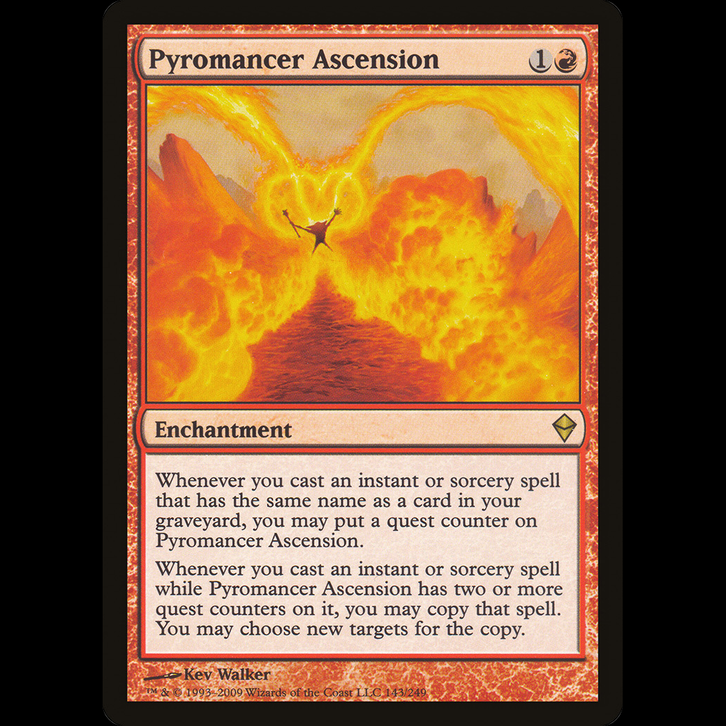 Whenever you cast an instant or sorcery spell that has the same name as a card in your graveyard, you may put a quest counter on Pyromancer Ascension.