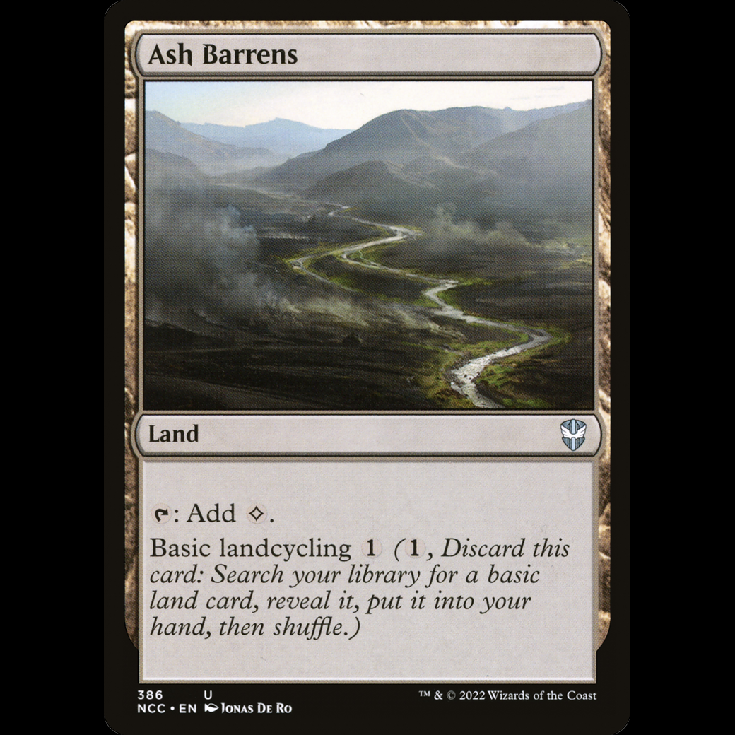 MTG Ash Barrens New Capenna Commander ncc#386: Add . Basic landcycling (, Discard this card: Search your library for a basic land card, reveal it, put it into your hand, then shuffle.)