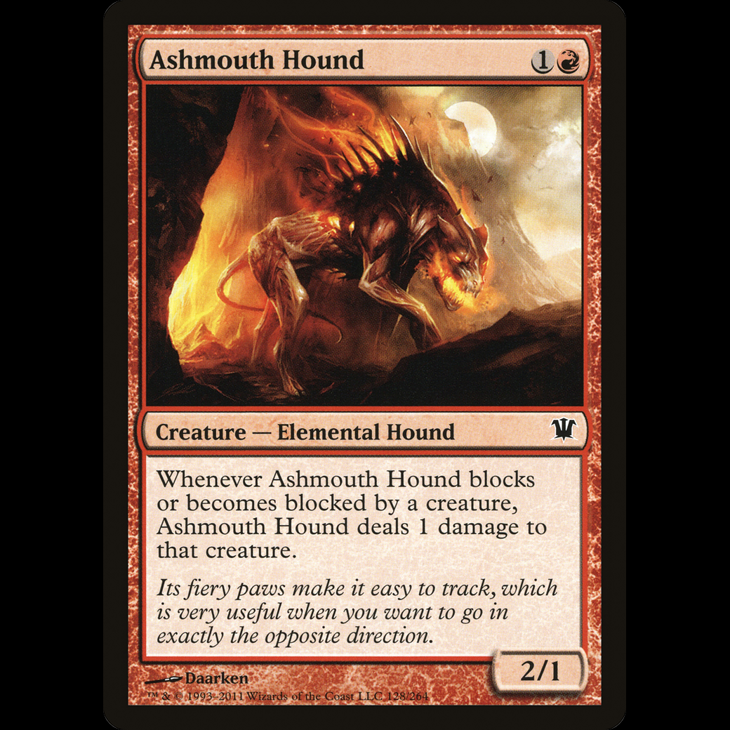 Whenever Ashmouth Hound blocks or becomes blocked by a creature, Ashmouth Hound deals 1 damage to that creature.