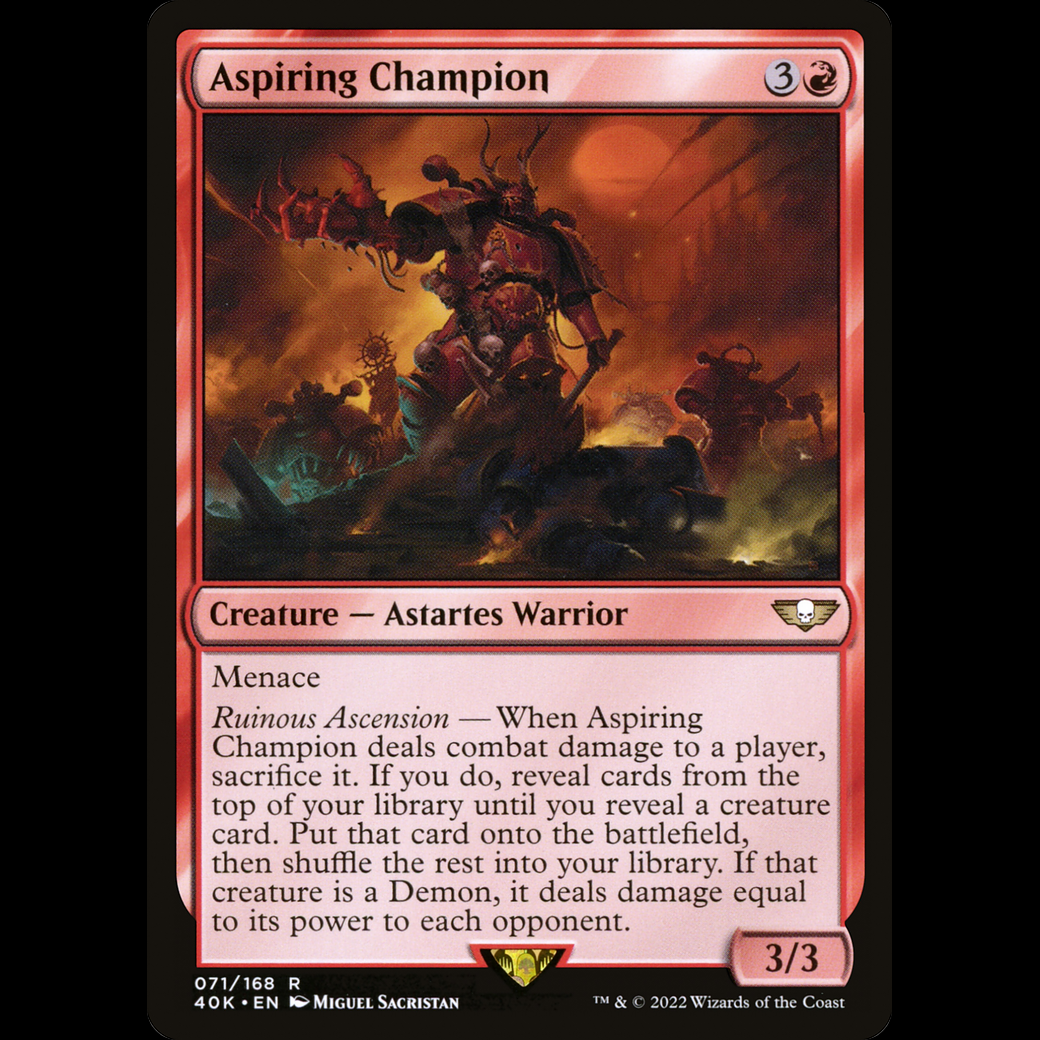 MTG Aspiring Champion Warhammer 40,000 Commander 40k#71 Menace Ruinous Ascension — When Aspiring Champion deals combat damage to a player, sacrifice it. If you do, reveal cards from the top of your library until you reveal a creature card. Put that card onto the battlefield, then shuffle the rest into your library. If that creature is a Demon, it deals damage equal to its power to each opponent.