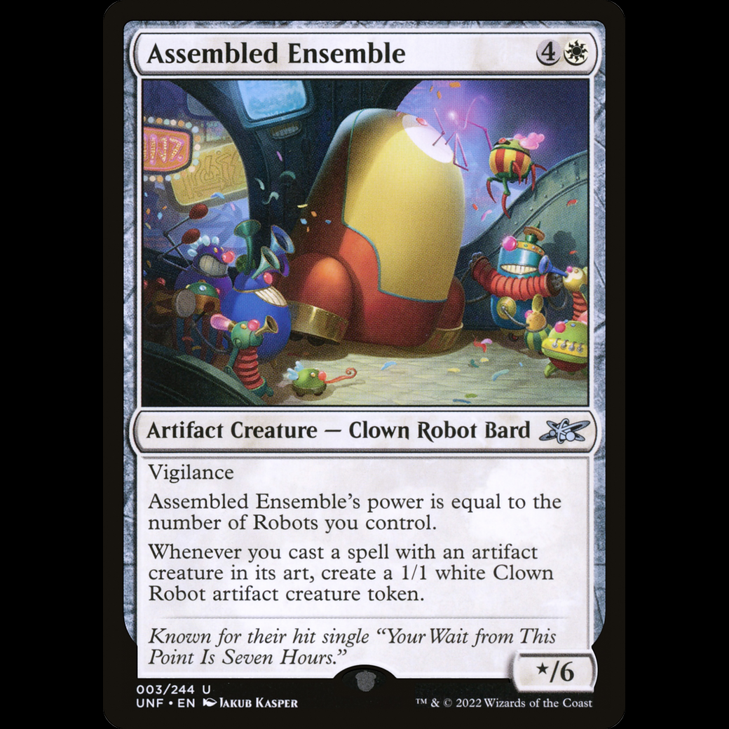 Whenever you cast a spell with an artifact creature in its art, create a 1/1 white Clown Robot artifact creature token.