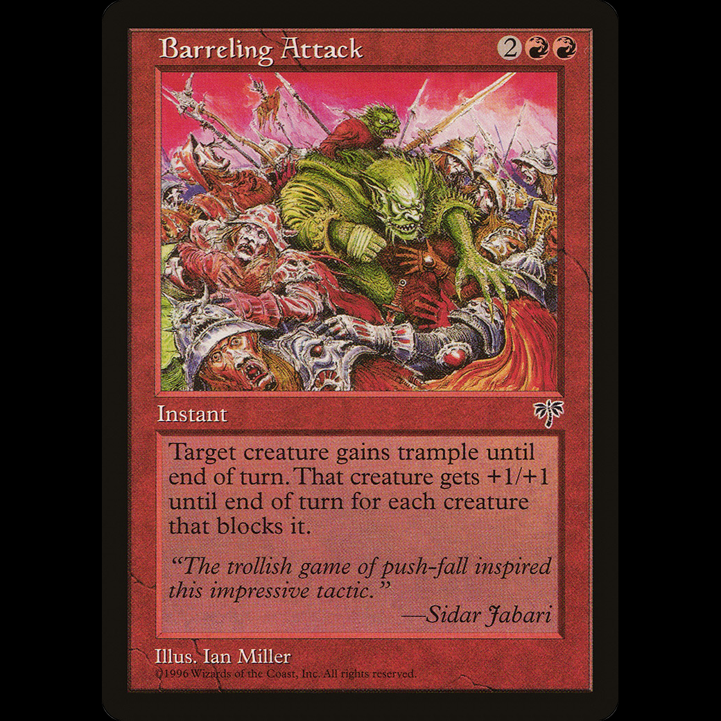 MTG Ataque arrollador (Barreling Attack) MirageTarget creature gains trample until end of turn. When that creature becomes blocked this turn, it gets +1/+1 until end of turn for each creature blocking it.