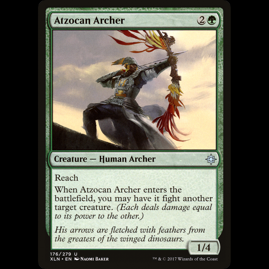When Atzocan Archer enters the battlefield, you may have it fight another target creature. (Each deals damage equal to its power to the other.)