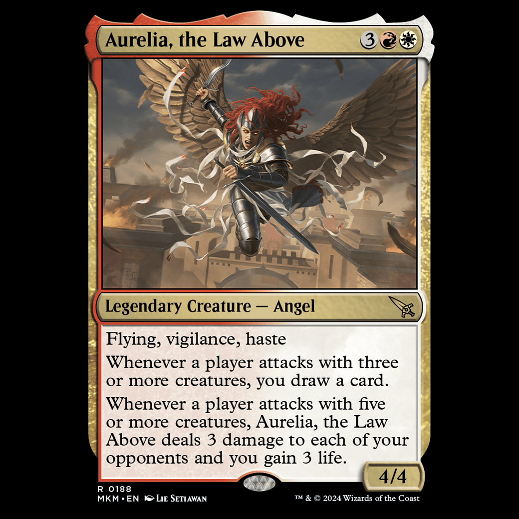 MTG Aurelia, la Ley Imperante (Aurelia, the Law Above) Murders at Karlov Manor mkm#188 Flying, vigilance, haste Whenever a player attacks with three or more creatures, you draw a card. Whenever a player attacks with five or more creatures, Aurelia, the Law Above deals 3 damage to each of your opponents and you gain 3 life.