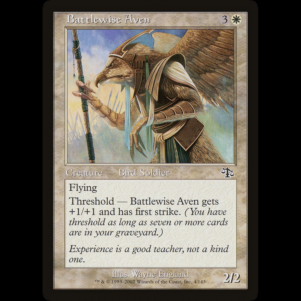 Threshold — As long as seven or more cards are in your graveyard, Battlewise Aven gets +1/+1 and has first strike.