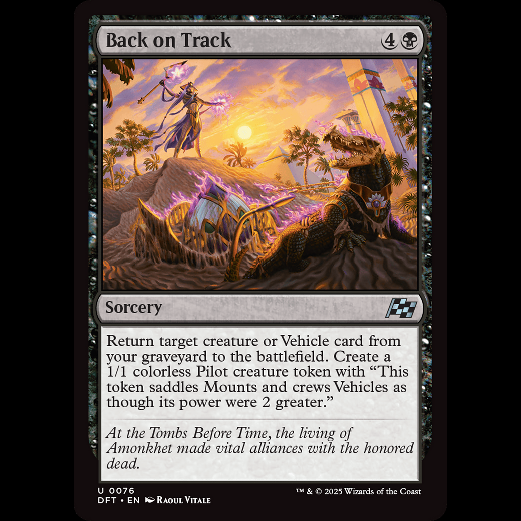 Return target creature or Vehicle card from your graveyard to the battlefield. Create a 1/1 colorless Pilot creature token with "This token saddles Mounts and crews Vehicles as though its power were 2 greater."