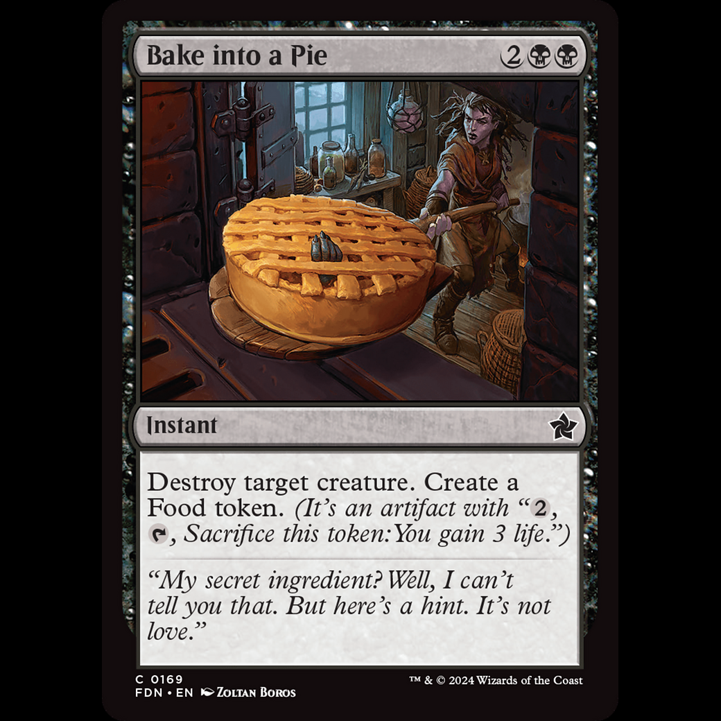 Destroy target creature. Create a Food token. (It's an artifact with ", , Sacrifice this token: You gain 3 life.")