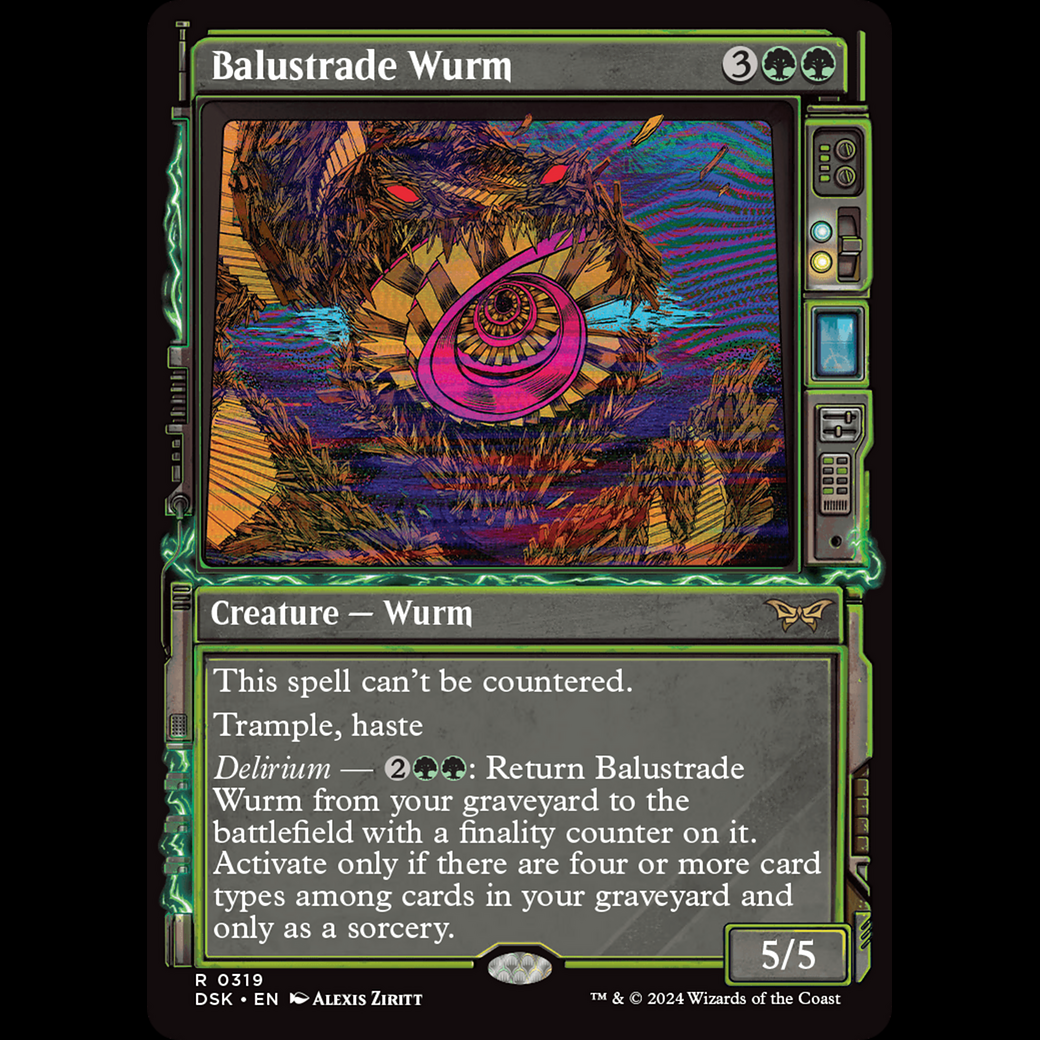 Delirium — : Return Balustrade Wurm from your graveyard to the battlefield with a finality counter on it. Activate only if there are four or more card types among cards in your graveyard and only as a sorcery.