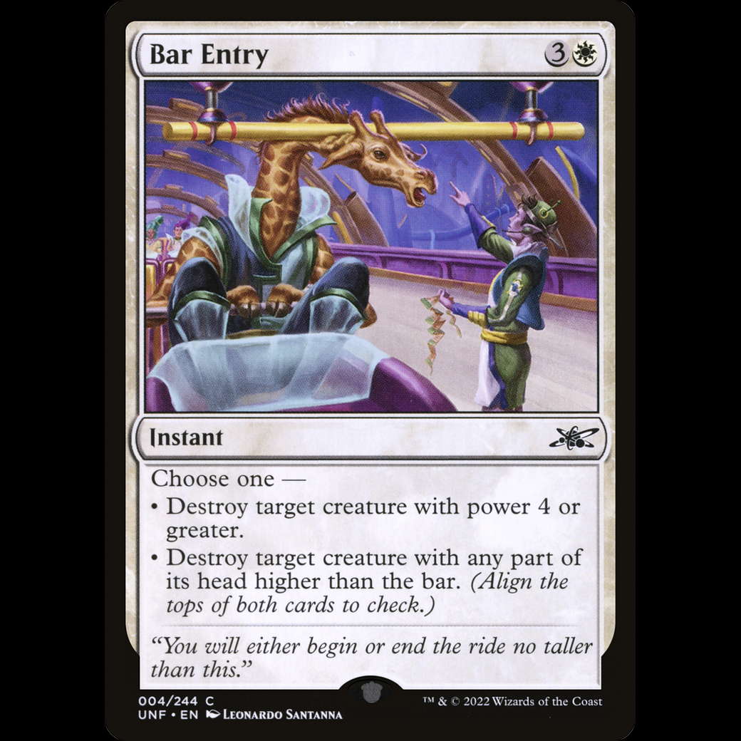 MTG Bar Entry Unfinity unf#4Choose one — • Destroy target creature with power 4 or greater. • Destroy target creature with any part of its head higher than the bar. (Align the tops of both cards to check.)